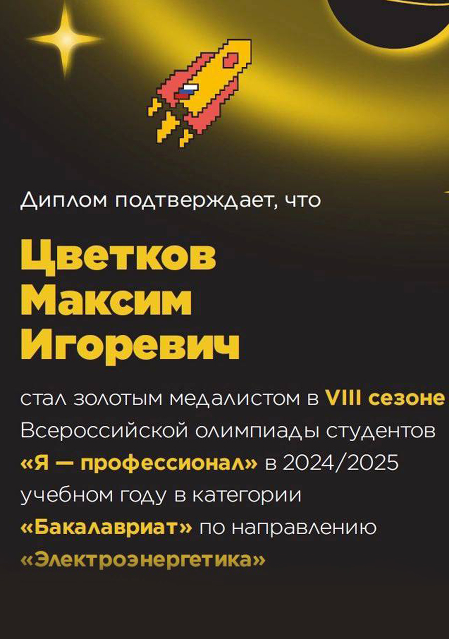 Золотым медалистом по направлению «Электроэнергетика» в категории "Бакалавриат" стал Максим Цветков (гр. 4-29).