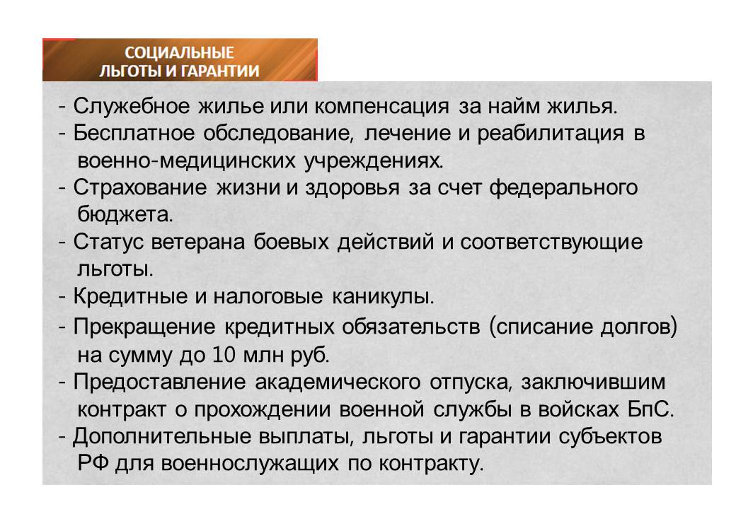 – Академический отпуск на период контракта, поступление в образовательные организации высшего образования вне конкурса на бюджетной основе.