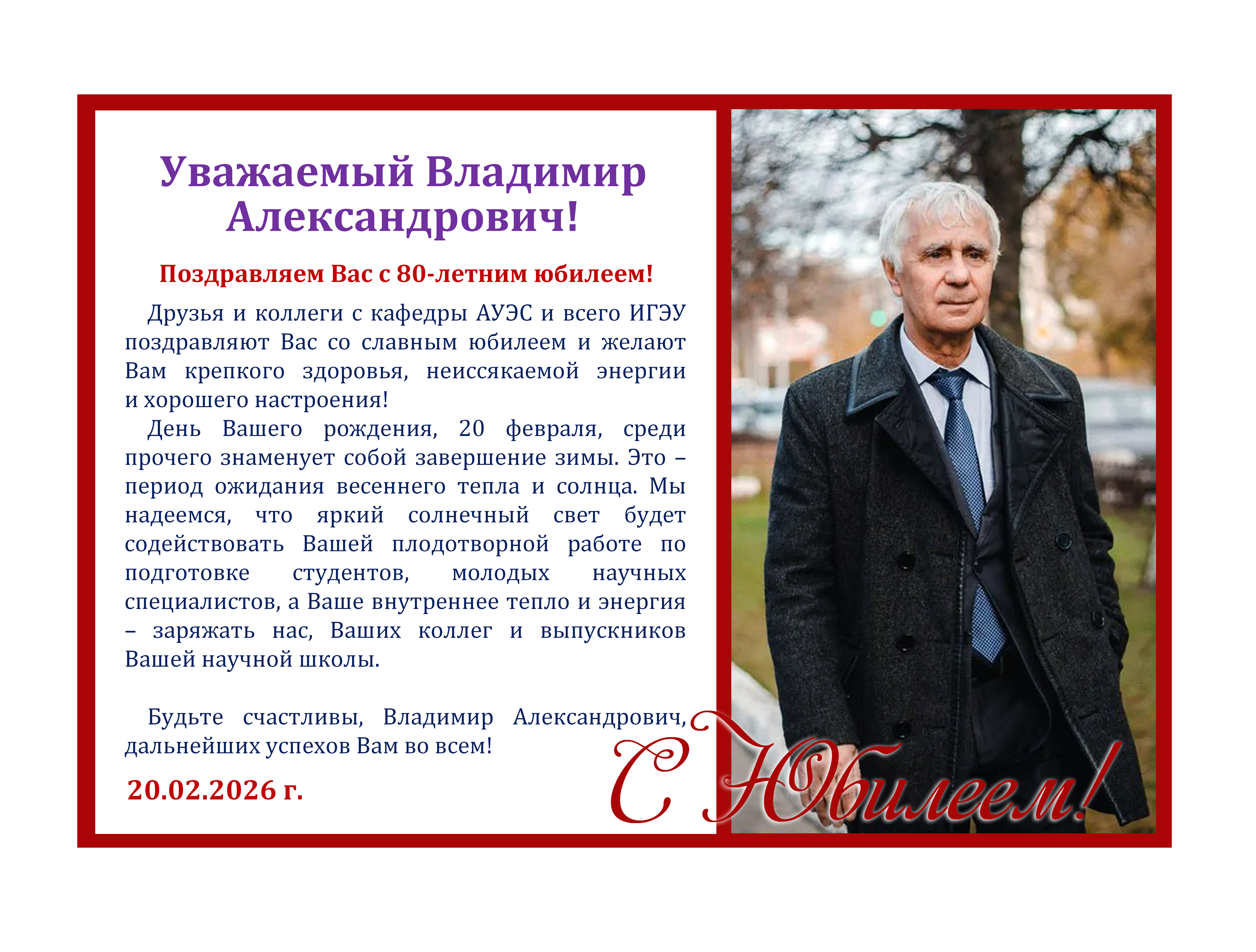 Уважаемый Владимир Александрович, коллектив кафедры «Автоматическое управление электроэнергетическими системами», друзья и коллеги из ИГЭУ от всей души поздравляют Вас с 80-летием!